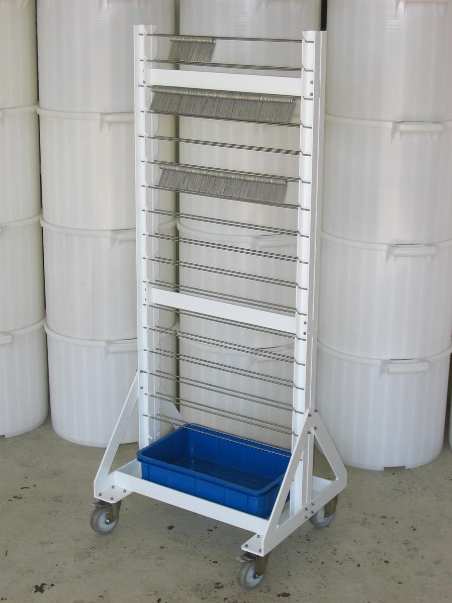 Deretter kan krokene magasineres i krokristemaskinen (4) som henger krokene på stenger slik at utbøyde og knekte kroker lett kan sorteres ut. Egnemaskinen (1) har en innebygget kontrollfunksjon som sorterer ut kroker med mindre feil slik at bare gode kroker blir egnet.