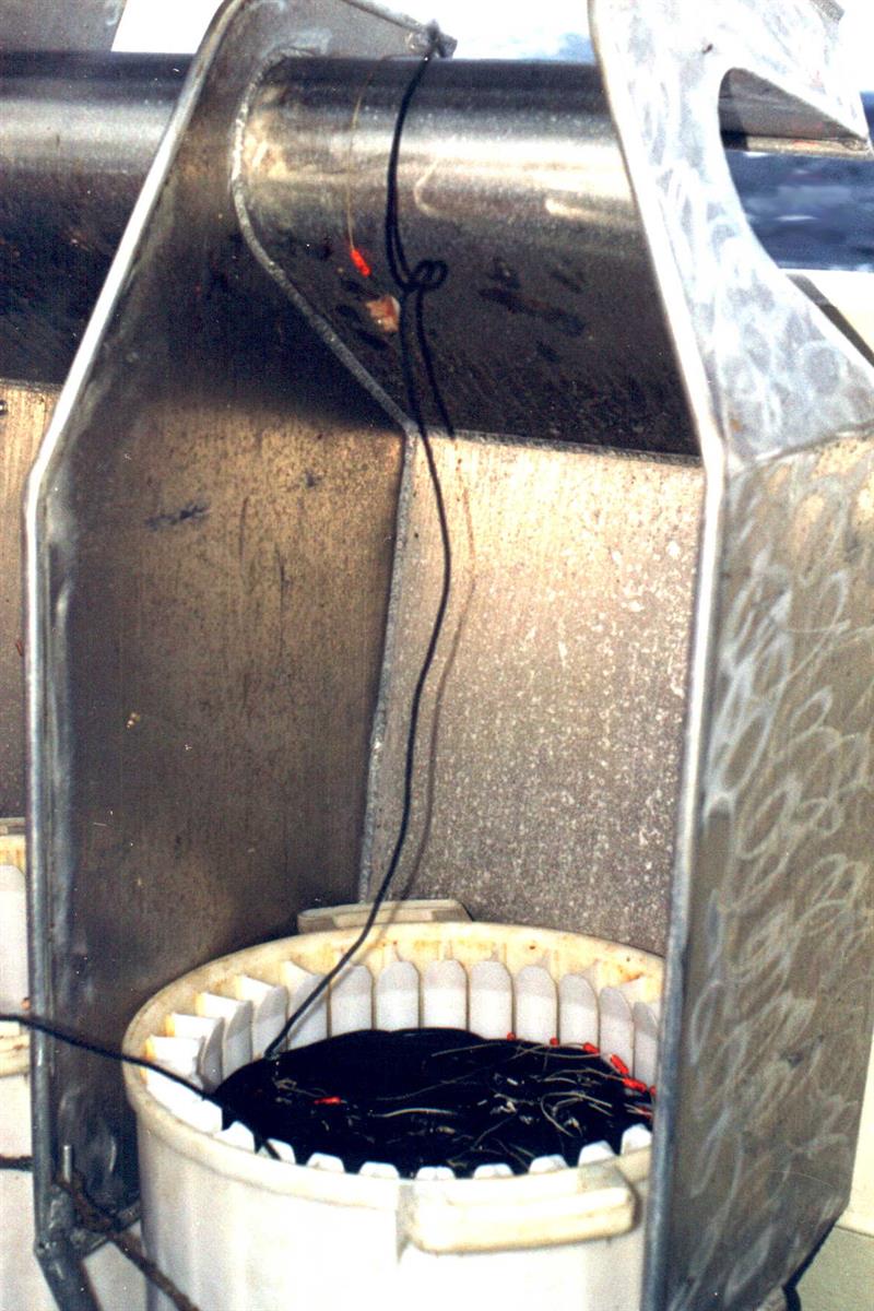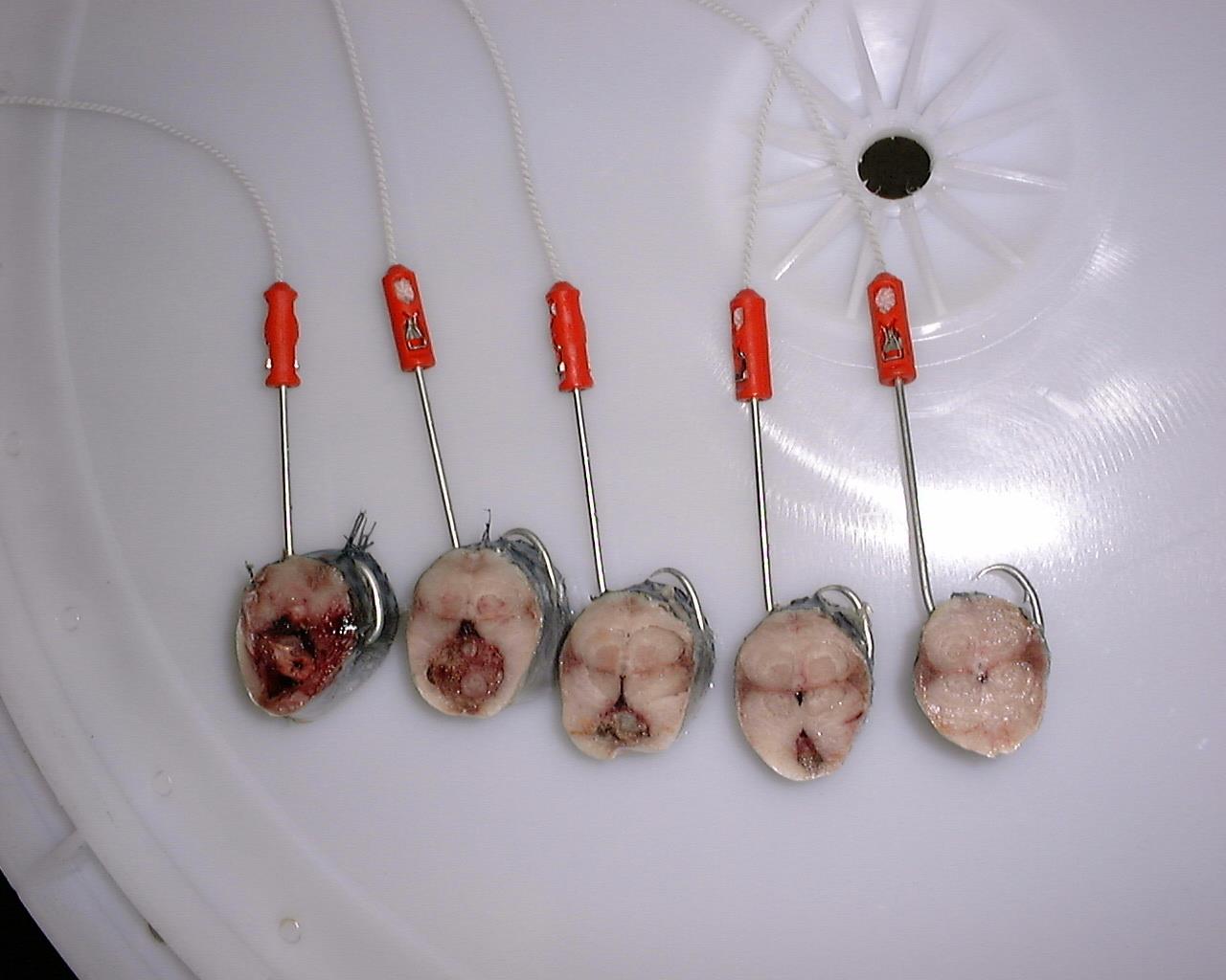 - Deretter kommer en roterende børste som børster kroken for agnrester. Bare kroken går gjennom børsta slik at man unngår at grunnlina blir innsmurt med gamle agnrester
